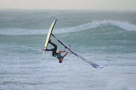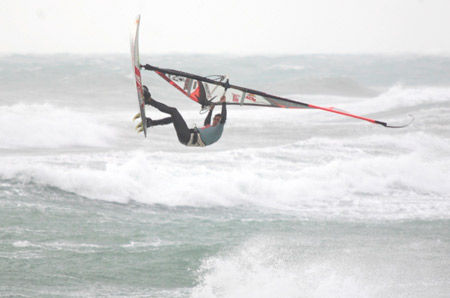 Le batterie riprendono ed è Francesco Cappuzzo del Circolo Albaria di Palermo che si aggiudica le prime. La gara viene di nuovo interrotta, il vento adesso è molto sopra i 50, l'anemometro arriva a segnare fino a 79 nodi!!! In questi periodi di sospensione il giovane Cappuzzo non smette di surfare e di saltare, sembra a suo agio in questa burrasca. Lo spettacolo delle schiume che nebulizzano è forte e nessuno lascia la spiaggia nonostante la sabbia voli ovunque.